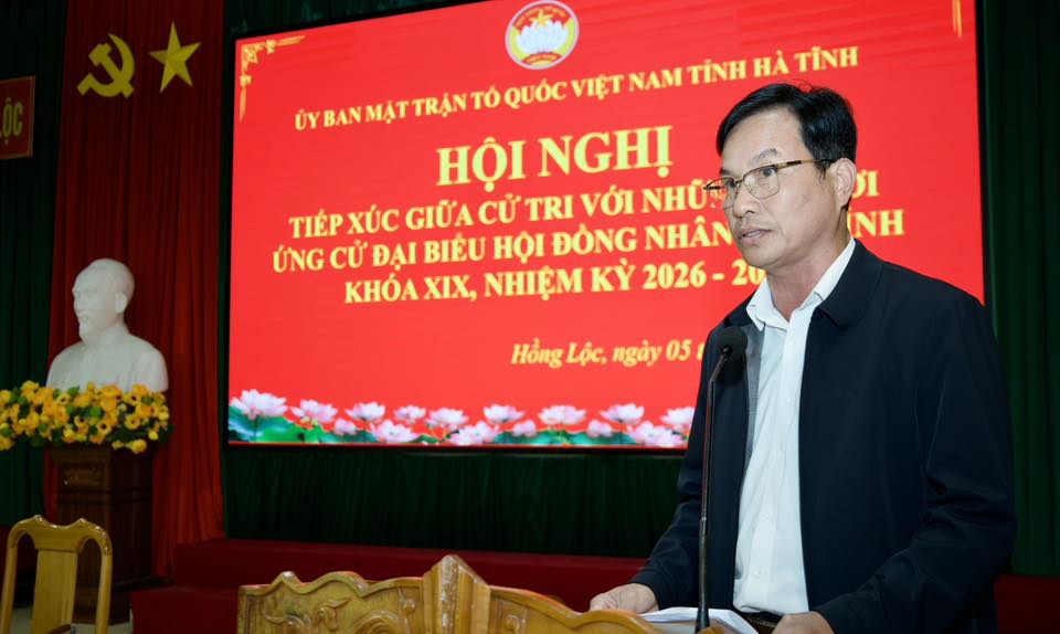 Chiều ngày 05/3/2026, Ban Thường trực Ủy ban MTTQ Việt Nam tỉnh Hà Tĩnh phối hợp với Ủy ban nhân dân và Ban Thường trực Ủy ban MTTQ xã Hồng Lộc tổ chức Hội nghị tiếp xúc cử tri để vận động bầu cử đối với những người ứng cử đại biểu Quốc hội khóa XVI và đại biểu HĐND tỉnh khóa XIX, nhiệm kỳ 2026 – 2031. Hội nghị được kết nối trực tuyến với các điểm cầu thuộc đơn vị bầu cử số 7 tại các xã: Can Lộc, Gia Hanh, Đồng Lộc, Tùng Lộc và Xuân Lộc.