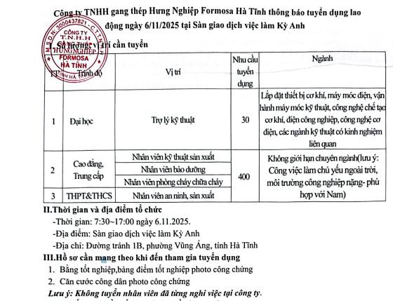 THÔNG BÁO: Trung tâm Dịch vụ việc làm Hà Tĩnh phối hợp với công ty TNHH Gang thép Hưng Nghiệp Formosa Hà Tĩnh tổ chức tuyển dụng, cụ thể như sau: