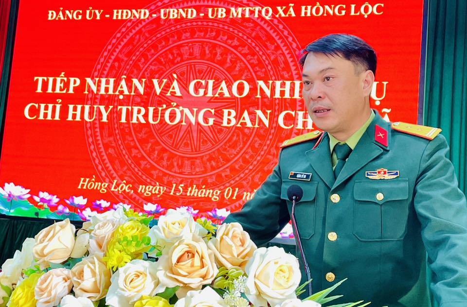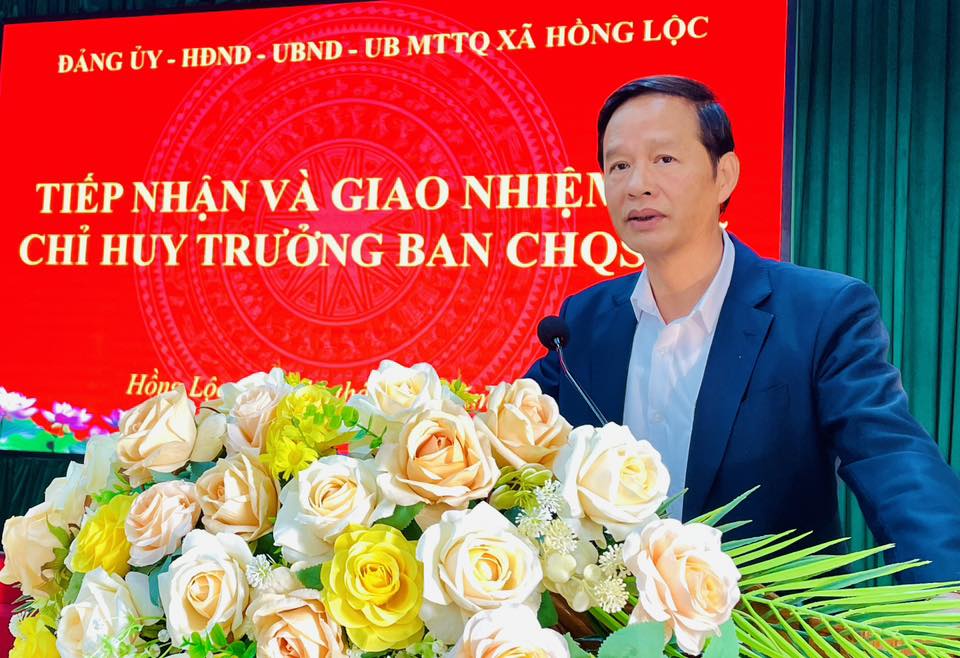 Phát biểu giao nhiệm vụ, lãnh đạo Bộ CHQS tỉnh, lãnh đạo xã Hồng Lộc ghi nhận năng lực, kinh nghiệm công tác của đồng chí Trung tá Đậu Minh Hưng; đồng thời đề nghị đồng chí trên cương vị công tác mới tiếp tục phát huy bản lĩnh chính trị, phẩm chất người quân nhân cách mạng; chủ động tham mưu cho cấp ủy, chính quyền địa phương trong lãnh đạo, chỉ đạo thực hiện nhiệm vụ quốc phòng - quân sự; tăng cường phối hợp với các lực lượng, góp phần giữ vững ổn định chính trị, trật tự an toàn xã hội trên địa bàn.
